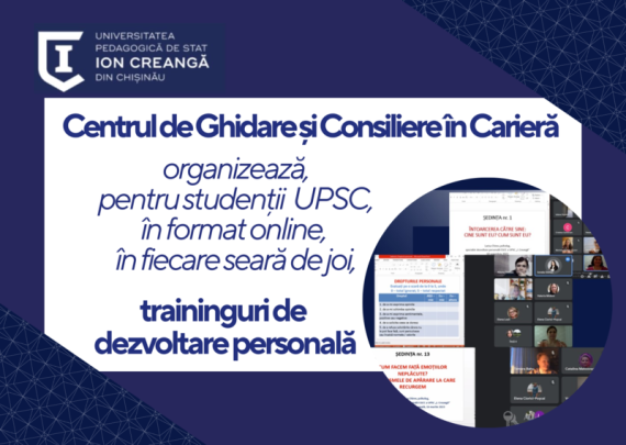 Centrul de Ghidare și Consiliere în Carieră al Universității Pedagogice de Stat „Ion Creangă” organizează, pe durata anului academic, pentru studenții crengieni, în format online, în fiecare seară de joi, trainingul de dezvoltare personală. Trainingul de dezvoltare personală este constituit din 20 ședințe în cadrul cărora studenții vor reflecta, discuta, […]