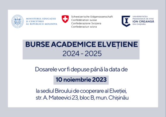 Biroul de cooperare al Elveției/ Reprezentanța Ambasadei Confederației Elvețiene anunță că, prin intermediul Comisiei federale pentru burse destinate studenților străini, Guvernul Elveției acordă cercetătorilor din Republica Moldova, pentru anul academic 2024-2025, următoarele tipuri de burse: O condiție obligatorie este cunoașterea la nivel înalt a unei limbi străine – franceza, germana, italiana sau engleza, în […]