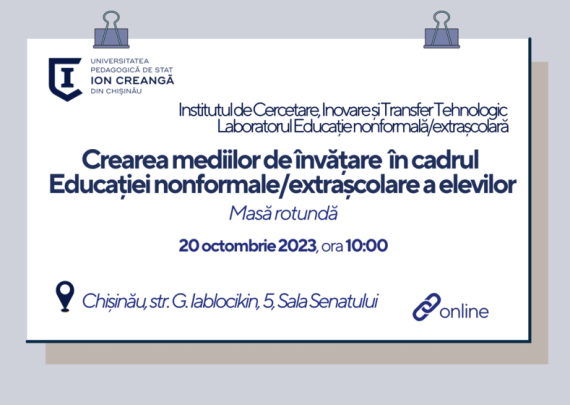 Universitatea Pedagogică de Stat „Ion Creangă” din Chișinău (UPSC) Institutul de Cercetare, Inovare și Transfer Tehnologic (ICITT)Laboratorul Educație nonformală/extrașcolară organizează, în regim mixt, masa rotundă „Crearea mediilor de învățare în cadrul Educației nonformale/extrașcolare a elevilor” Data: 20 octombrie 2023, ora 10:00 Locația: ICITT, str. Gh. Iablocikin 5, Sala Senatului […]
