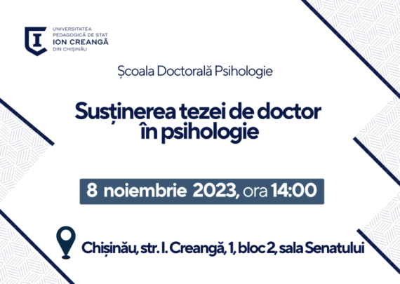 Anunț privind susținerea publică a tezei de doctor în psihologie Candidat: DZÎC Ilona Conducător științific: GONȚA Victoria, conf. univ. dr. Tema tezei: СОЦИАЛЬНО-ПСИХОЛОГИЧЕСКАЯ АДАПТАЦИЯ НОВОБРАНЦЕВ К АРМЕЙСКИМ УСЛОВИЯМ/ ADAPTAREA SOCIO-PSIHOLOGICĂ A MILITARILOR RECENT ÎNCORPORAȚI LA MEDIU MILITAR Specialitatea: 511.03 – Psihologie socială Data: 08 noiembrie 2023Ora: 14:00 Locul: Universitatea Pedagogică de Stat „Ion Creangă” din Chişinău, Bl. […]