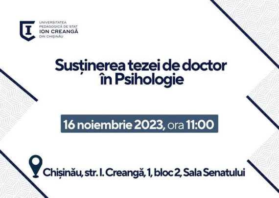 Candidat: POPA RODICA Conducător științific: ȘLEAHTIȚCHI MIHAIL, dr habilitat în psihologie, dr în pedagogie, profesor universitar Tema tezei:BULLYING ȘI STIMA DE SINE LA ELEVII DE VÂRSTĂ ADOLESCENTINĂ Specialitatea: 511.02 – Psihologia dezvoltării și psihologia educațională Data: 16 noiembrie 2023, Ora:11.00 A.M. Locul: Universitatea Pedagogică de Stat „Ion Creangă” – Str. Ion Creangă nr. 1, bloc 2, sala Senatului Componența Comisiei […]