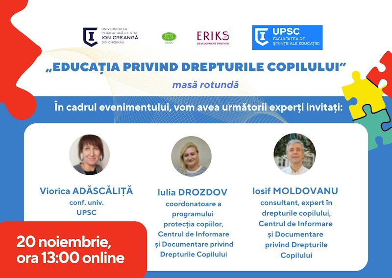 În contextul zilei Universale a Drepturilor Copilului care se marchează pe 20 noiembrie, Catedra Pedagogie Preșcolară, Educație Fizică și Dans din cadrul Facultății de Științe ale Educației, UPS „Ion Creangă”, în parteneriat cu Centrul de Informare și Documentare privind Drepturile Copilului din Moldova (CIDDC) și Fundația ERIKS Development Partner, Vă invită să participați la masa rotundă cu genericul „Educația privind drepturile copilului”.