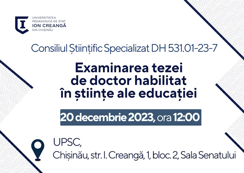 Se anunță examinarea, în Consiliul Științific Specializat DH 531.01-23-7, a tezei de doctor habilitat în științe ale educației, cu tema Reconstrucția pedagogică a eticii în instituția educației, elaborată de PANIȘ Aliona, doctor, conferențiar universitar; consultant științific CALLO Tatiana, doctor habilitat în pedagogie, profesor universitar.