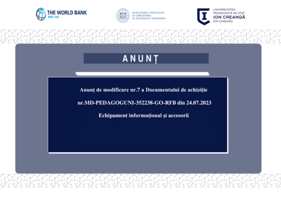 Anunț de modificare nr.7 a Documentului de Achizițienr. MD-PEDAGOGUNI-352238-GO-RFBdin 24.07.2023 Echipament informațional şi accesorii Nr. CDO: MD-PEDAGOGUNI-352238-GO-RFB Autoritatea contractantă: Instituția Publică Universitatea Pedagogică de Stat „Ion Creangă” din Chișinău Proiectul: Învățământul Superior din Moldova Subproiectul: Asigurarea calității și relevanței formării profesionale a viitorilor pedagogi prin programe de studii inovative și […]