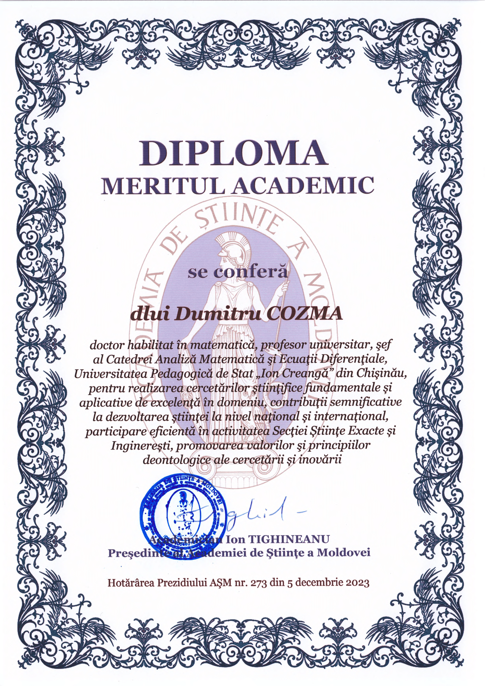 Recent, Academia de Științe a Moldovei a conferit dlui Dumitru COZMA, doctor habilitat, profesor universitar, șef al Catedrei de Analiză Matematică și Ecuații Diferențiale de la Facultatea de Matematică, UPSC, Diploma Meritul Academic. Înalta distincție i-a fost conferită dlui Cozma pentru realizarea cercetărilor științifice fundamentale și aplicative de excelență în domeniu, pentru contribuții semnificative la nivel național, dar și internațional, precum și pentru participare eficientă în activitatea Secției Științe Exact și Inginerești, promovarea valorilor și principiilor deontologice ale cercetării și inovării.