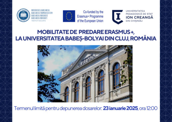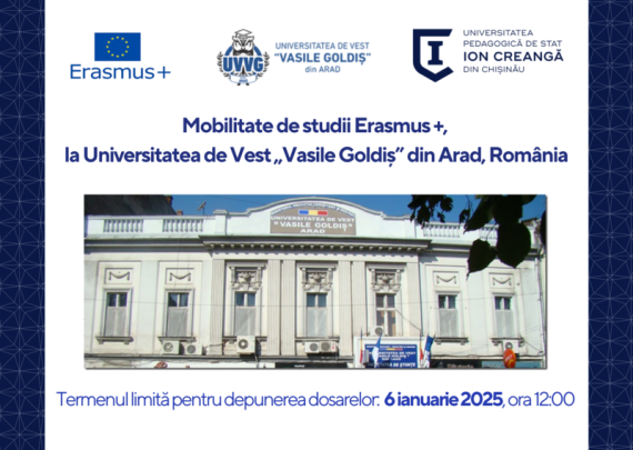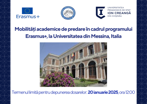 Mobilități academice de predare în cadrul programului Erasmus+, la Universitatea din Messina, Italia Secția de Relații Internaționale și Managementul Proiectelor a Universității Pedagogice de Stat „Ion Creangă” din Chișinău anunță concurs de depunere a dosarelor pentru 2 (două) burse de predare pentru profesorii UPSC la Universitatea din Messina, Italia. Termen […]