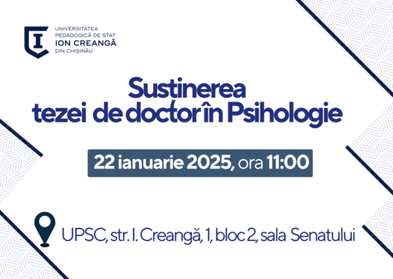 Candidat: DICU Adriana Conducător științific: OLĂRESCU Valentina, dr., prof. univ. Tema tezei: INTERVENȚIA PSIHOLOGICĂ ASUPRA COPIILOR CU PĂRINȚII DIVORȚAȚI Specialitatea: 511.02 Psihologia dezvoltării și psihologia educațională Data: 22.01.2025 Ora: 11:00 Locul: Sala Senatului, Universitatea Pedagogică de Stat „Ion Creangă” din Chișinău Componența Comisiei de Susținere Publică a tezei de doctor: Președintele Comisiei: VÎRLAN Maria, profesor universitar, doctor în […]