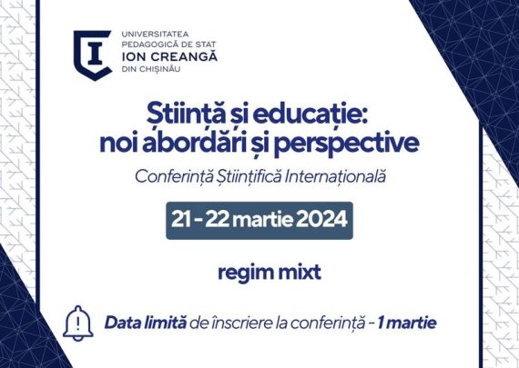 Universitatea Pedagogică de Stat „Ion Creangă” din Chișinău organizează Conferința Științifică Internațională „Știință și educație: noi abordări și perspective”, care va avea loc pe 21 – 22 martie 2024, în regim mixt. La evenimentul științific consacrat problemelor actuale, realizărilor și perspectivelor de dezvoltare în cadrul științelor sociale, umanistice, exacte, al […]