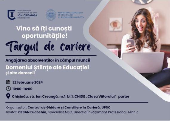 În vederea creșterii ratei de angajabilitate în rândul absolvenților instituției, domeniul Științe ale educației și alte domenii, precum și o mai bună inserție a acestora pe piața muncii, Universitatea Pedagogică de Stat „Ion Creangă” din Chișinău (UPSC) vă invită să participați la Târgul de cariere UPSC, 2024. Târgul va avea […]