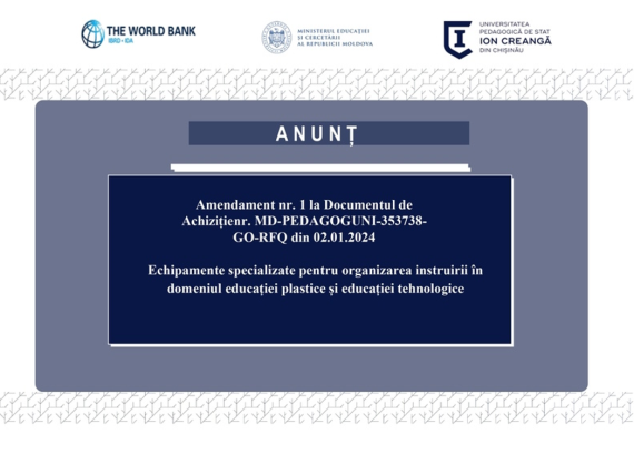 Amendamentul nr. 1 din 12.01.2024 la Documentul de Achiziție nr. MD-PEDAGOGUNI-353738-GO-RFQ din 02.01.2024 Echipamente specializate pentru organizarea instruirii în domeniul educației plastice și educației tehnologice Nr. CDO: MD-PEDAGOGUNI-353738-GO-RFQ Subproiectul: Asigurarea calității și relevanței formării profesionale a viitorilor pedagogi prin programe de studii inovative și conexe la piața muncii, (ACRVP). Proiectul: […]