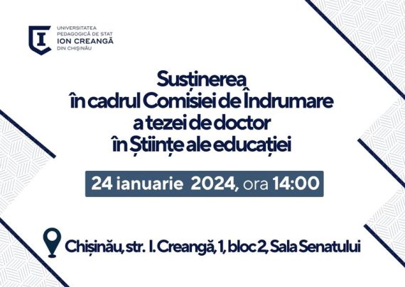 Candidat: GAVRILUȚ Monalisa-Laura Conducător științific: CARA Angela, doctor în pedagogie, conf. Tema tezei: „Dezvoltarea competenței lectorale și a scrierii creative la elevii treptei primare de învățământ” Specialitatea științifică: 531.01. Teoria Generală a Educației Data: 24.01.2024 Ora: 14:00 Locul: Universitatea Pedagogică de Stat „Ion Creangă” din Chișinău, Sala Senatului, blocul II. […]