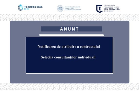 Notificarea privind atribuirea contractului Selecția consultanților individuali Contract nr. MD-PEDAGOGUNI-353948-CS-INDV ,,Consiliere și educație în context intercultural și expertiza programului” Denumirea proiectului Proiectul Învățământul Superior din Moldova Numărului creditului 6542-MD Denumirea subproiectului „Asigurarea calității și relevanței formării profesionale a viitorilor pedagogi prin programe de studii inovative și conexe la piața muncii” […]
