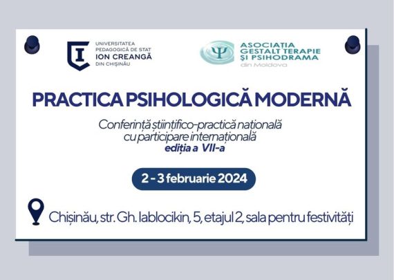 Universitatea Pedagogică de Stat „Ion Creangă” din Chișinău șiAsociația Gestalt-Terapie și Psihodramă din Moldova vă invită să participați la cea de-a VII-a ediție a Conferinței științifico-practice naționale cu participare internațională „Practica psihologică modernă” pe 2-3 februarie 2024, la dresa: str. Gh. Iablocikin, 5, etajul 2, sala pentru festivități. Conferința va […]
