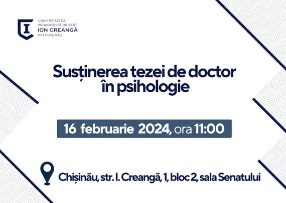 Candidat: Haidu Felicia Aurica Conducător științific: Losîi Elena, dr., conf. univ. Tema tezei: Manifestarea agresivității la conducătorii auto și modalități de diminuare Specialitatea: 511.02 Psihologia dezvoltării şi psihologia educațională Data: 16 februarie 2024 Ora: 11:00 Locul: Universitatea Pedagogică de Stat „Ion Creangă” din Chișinău, str. Ion Creangă, 1, bl. 2, Sala Senatului Componența Comisiei de Susținere […]