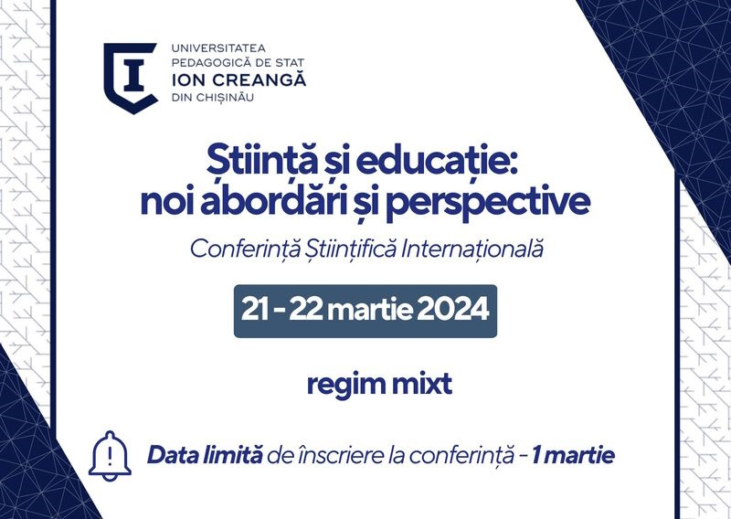 Universitatea Pedagogică de Stat „Ion Creangă” din Chișinău organizează Conferința Științifică Internațională „Știință și educație: noi abordări și perspective”, care va avea loc pe 21 – 22 martie 2024, în regim mixt.
