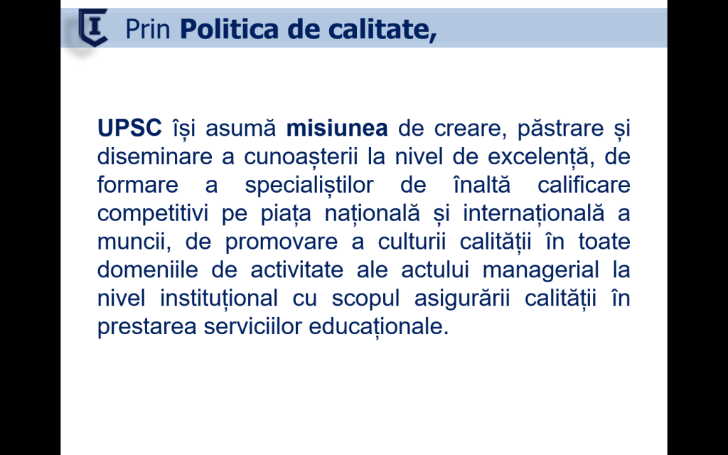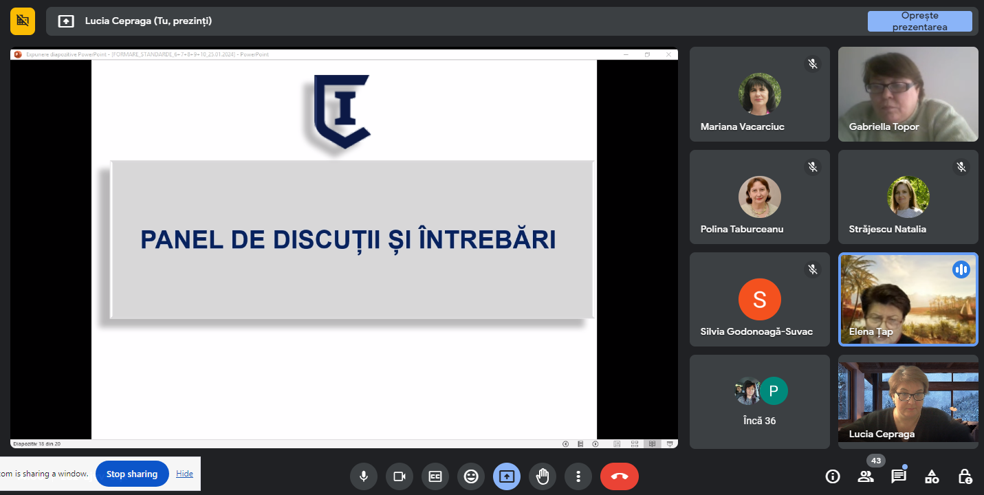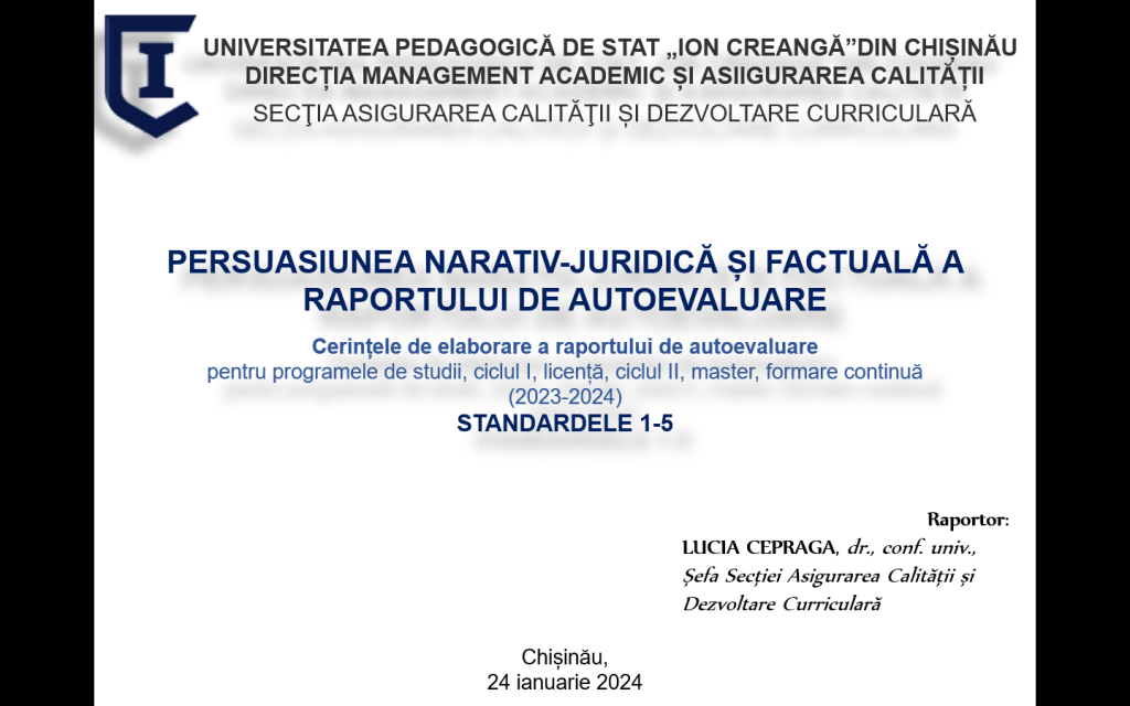 Managerii instituționali, coordonatorii ai programelor de studii, cadrele didactice, reprezentanți ai SMC din cadrul UPSC s-au reunit pentru două zile, 24.01.2024 – 25.01.2024, într-o nouă sesiune de formare cu genericul „PERSUASIUNEA NARATIV-JURIDICĂ ȘI FACTUALĂ A RAPORTULUI DE AUTOEVALUARE”, UPSC.