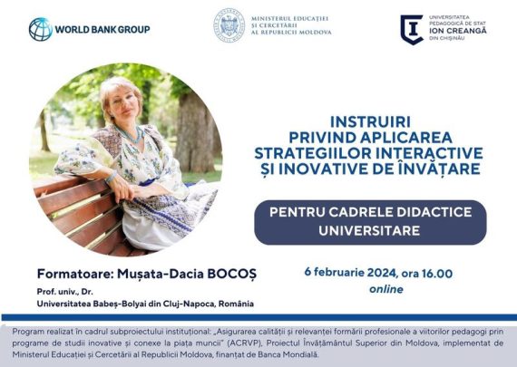 La data de 6 februarie 2024 vor demara sesiunile de instruire a cadrelor didactice din Universitatea Pedagogică de Stat „Ion Creangă” din Chișinău privind aplicarea strategiilor interactive și inovative în procesul de predare-învățare-evaluare din domeniul Științe ale Educației. Programul de instruire este elaborat de doamna Mușata-Dacia BOCOȘ, Prof. univ. Dr. […]