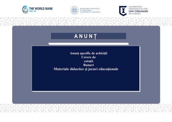 Țara: Republica Moldova Instituția: Instituția Publică Universitatea Pedagogică de Stat „Ion Creangă” din Chișinău Titlul proiectului: Învățământul Superior din Moldova Titlul subproiectului: Asigurarea calității și relevanței formării profesionale a viitorilor pedagogi prin programe de studii inovative și conexe la piața muncii, (ACRVP) Obiectul achiziției: Materiale didactice si jocuri educaționale Ref. […]