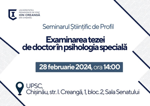Se anunță pentru examinare teza de doctor în psihologia specială în Seminarul Științific de Profil, organizat în cadrul Universităii Pedagogice de Stat „Ion Creangă” din Chișinău. Candidat: Ciubotaru Natalia Conducător ştiinţific: Bodorin Cornelia, doctor în psihologie, conferențiar universitar Tema tezei: Dezvoltarea auzului emoțional la copiii cu dizabilități auditive Specialitatea: 511.06 […]
