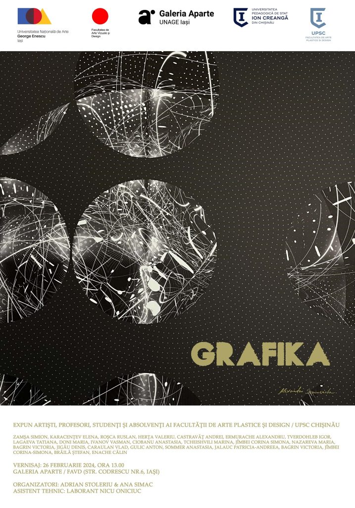 În data de 26 februarie 2024, în incinta Galeriei Aparte din cadrul Universității Naționale de Arte „George Enescu” din Iași, a avut loc vernisajul expoziției GRAFIKA, expoziție a artiștilor, profesorilor, studenților și absolvenților Facultății de Arte Plastice și Design din cadrul Universității Pedagogice de Stat „Ion Creangă” din Chișinău.