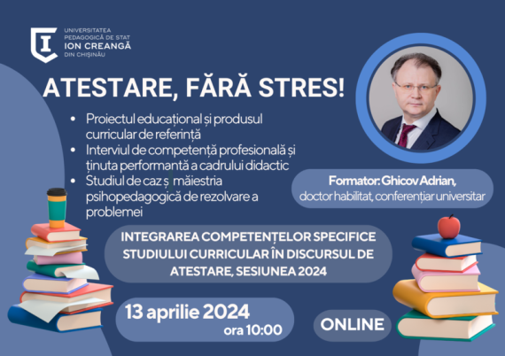 ATESTARE, FĂRĂ STRES! INTEGRAREA COMPETENȚELOR SPECIFICE STUDIULUI CURRICULAR ÎN DISCURSUL DE ATESTARE, SESIUNEA 2024: – Proiectul educațional și produsul curricular de referință– Interviul de competență profesională și ținuta performantă a cadrului didactic.– Studiul de caz și măiestria psihopedagogică de rezolvare a problemei Formator: Ghicov Adrian, dr. hab., conf. univ., șeful […]