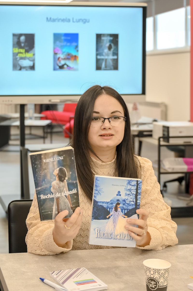 Deux invités inspirées et inspirantes ont présenté leurs compétences rédactionnelles et partagé leur propre expérience d’écriture, de publication et de promotion de leurs livres, auprès des jeunes francophones. L’une d’elles est Mme LUNGU Marinela, une jeune auteure, diplômée de l’UPEIC, qui travaille comme enseignante, mais qui écrit aussi avec une grande passion. L’autre invitée a été Mme COPACINSCHI Angela, professeure au Département de Philologie Romane et Germanique, qui a également commencé à écrire des livres.