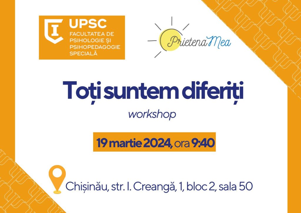 Cu ocazia Zilei Internaționale a Sindromului Down marcată anual în data de 21 martie, Facultatea de Psihologie și Psihopedagogie Specială, UPSC, în colaborare cu Asociația Obșteească „Prietena mea”, organizează workshopul cu genericul „Toți suntem diferiți”.
