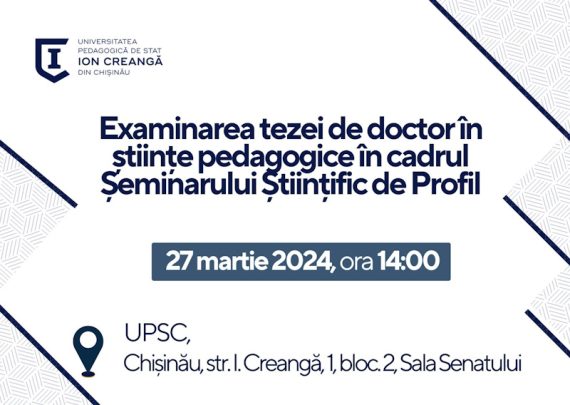 Seminarul Ştiinţific de Profil 533.01 – Pedagogie universitară din cadrul Universității Pedagogice de Stat „Ion Creangă” din Chișinău anunţă examinarea tezei de doctor în ştiinţe pedagogice „Formarea limbajului de specialitate în limba română la mediciniști (străini)”, realizată de Aliona BUSUIOC, conducător ştiinţific, Alexandra BARBĂNEAGRĂ, dr., conf. univ. Ședința S.Ş.P. va avea […]