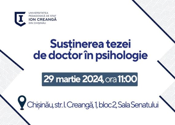 Candidat:Vasiliu Dan Conducător științific: Adăscălița Viorica, dr., conf. univ. Tema tezei:Influența factorilor de personalitate din teoria social-cognitivă asupra performanței academice a studenților Specialitatea: 511.02 Psihologia dezvoltării şi psihologia educațională Data: 29 martie 2024 Ora: 11:00 Locul: Universitatea Pedagogică de Stat „Ion Creangă” din Chișinău, str. Ion Creangă, 1, bl. 2, Sala Senatului Componența Comisiei […]