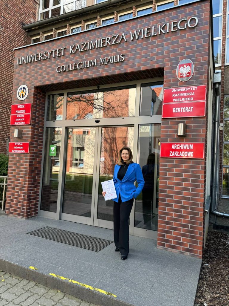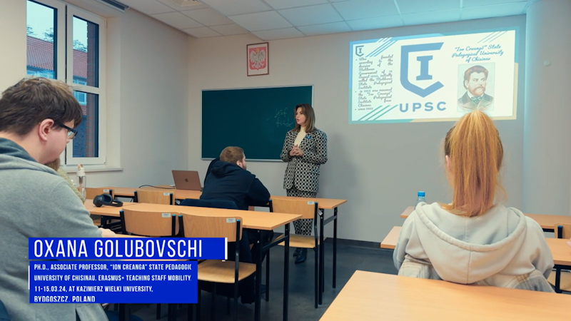În baza Acordului de colaborare, dna Oxana Golubovschi, dr., conf. univ., în cadrul Facultății de Limbi și Literaturi Străine de la Universitatea Pedagogică de Stat „Ion Creangă” din Chișinău, a desfășurat o mobilitate academică de predare, ERASMUS+Teaching staff mobility, perioada 11 – 15 martie 2024, la Universitatea Kazimierz Wielki, Bydgoszcz, Polonia.