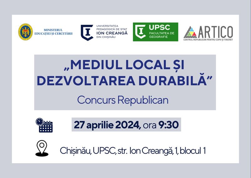 La 27 aprilie 2024, Facultatea de Geografie a Universității Pedagogice de Stat „Ion Creangă” din Chișinău organizează Concursul Republican „Mediul local și dezvoltarea durabilă”.