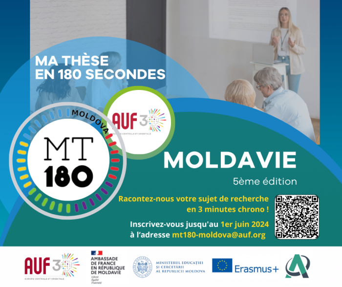 Biroul Național al Agenției Universitare a Francofoniei (AUF) din Republica Moldova, în parteneriat cu Ambasada Franței în Republica Moldova, Erasmus+ Moldova, Agenția Națională de Asigurare a Calității în Educație și Cercetare și Ministerul Educației și Cercetării din Republica Moldova anunță cea de-a cincea ediție a concursului „Teza mea în 180 de secunde” în Republica Moldova.