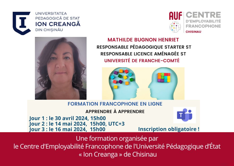 Centrul de Angajabilitate Francofon al Universității Pedagogice de Stat „Ion Creangă” din Chișinău anunță o formare în format online pentru toți studenții francofoni și profesorii lor, cu titlul „Învață să înveți”, care face parte din axa nr.2, formare de soft skills.