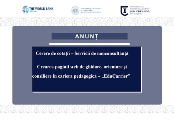 Țara: Republica MoldovaInstituția: Instituția Publică Universitatea Pedagogică de Stat „Ion Creangă” din ChișinăuTitlul proiectului: Învățământul Superior din Moldova Titlul subproiectului: Asigurarea calității și relevanței formării profesionale a viitorilor pedagogi prin programe de studii inovative și conexe la piața muncii, (ACRVP) Obiectul achiziției: Crearea paginii web de ghidare, orientare și consiliere […]