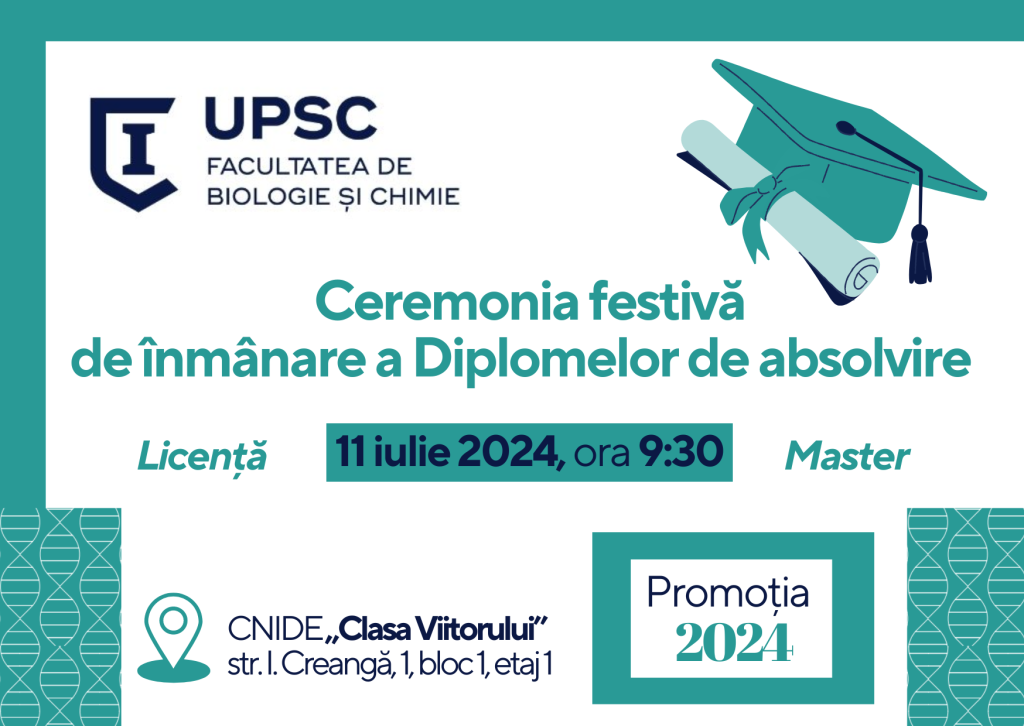 Facultatea de Biologie și Chimie anunță Ceremonia festivă de înmânare a diplomelor de studii superioare (licență și master), promoția 2024.