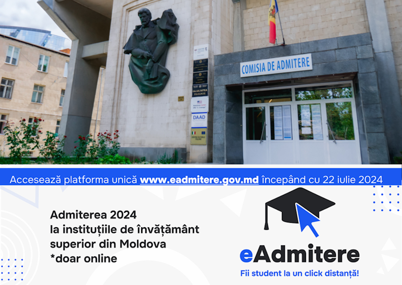 În R. Moldova, astăzi, 22 iulie 2024, a început admiterea la instituțiile de învățământ superior, proces, care, în premieră pentru țară, se desfășoară în format online. Ministerul Educației și Cercetării al R. Moldova a lansat eadmitere.gov.md – o platformă pentru admiterea online la studii de licență în universități. Candidații pot selecta cel mult 3 universități și, în ordinea prioritară, câte cel mult 3 programe de studii din cadrul fiecărei instituții selectate.