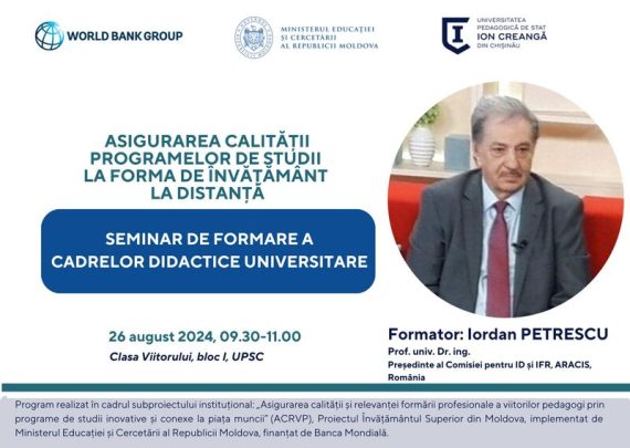 Stimați colegi, Vă invităm să participați la Seminarul de formare a cadrelor didactice universitare cu tema: „Asigurarea calității programelor de studii superioare la forma de învățământ la distanță”. Seminarul va avea loc luni, 26 august 2024, începând cu ora 09.30, în sala Google, Clasa Viitorului, bloc I al UPSC. Scopul […]