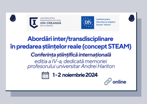 Universitatea Pedagogică de Stat „Ion Creangă” din Chișinău șiInstitutul pentru Dezvoltare și Inițiative Sociale „Viitorul” organizează și Vă invită în calitate de participant activ la Conferința științifică internațională „Abordări inter/transdisciplinare în predarea științelor reale (concept STEAM)”, ediția a IV-a, dedicată memoriei profesorului universitar Andrei Hariton care se va desfășura în […]