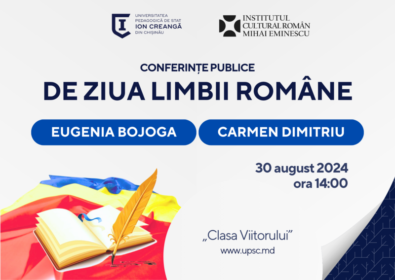 Institutul Cultural Român „Mihai Eminescu” la Chișinău în colaborare cu Universitatea Pedagogică de Stat „Ion Creangă” din Chișinău și Universitatea de Stat din Comrat organizează, pentru a marca Ziua Limbii Române în Republica Moldova, două conferințe publice susținute de reputații profesori de limbă română: Eugenia Bojoga, lector universitar la Universitatea „Babeș-Bolyai” din Cluj-Napoca și lector.univ.dr. Carmen Dimitriu, de la Institutul Limbii Române din București. Evenimentele vor avea loc pe data de 29 august 2024, ora 11.00, în Sala de Conferințe a Universității de Stat din Comrat și pe data de 30 august 2024, ora 14.00, la „Clasa Viitorului” din cadrul Universității Pedagogice de Stat „Ion Creangă” din Chișinău.