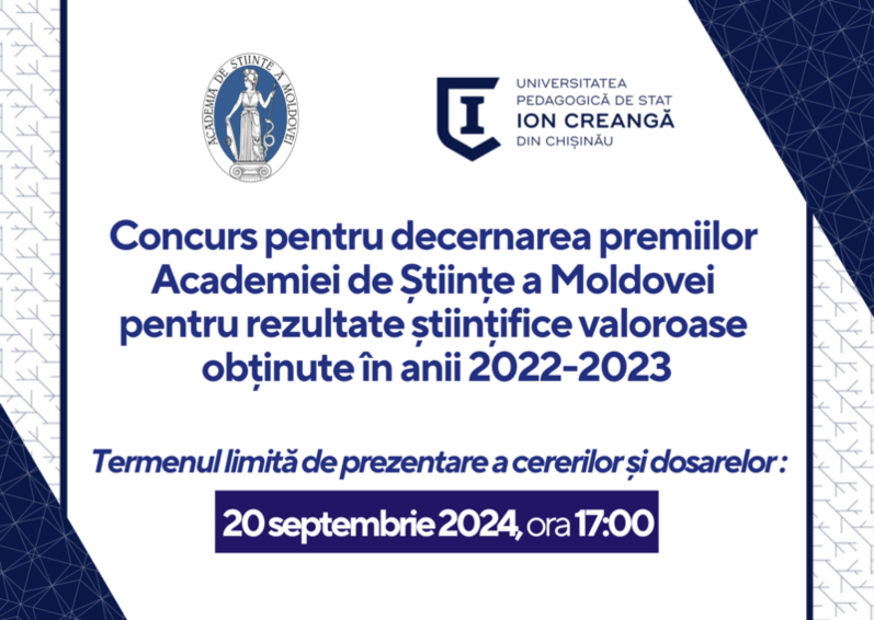 În conformitate cu Hotărârea Prezidiului nr. 119 din 30 iulie 2024, Academia de Ştiinţe a Moldovei anunţă concursul în vederea decernării Premiilor AȘM pentru rezultate științifice valoroase obținute în anii 2022–2023 la domeniile ştiinţelor sociale, economice, umanistice și arte, conform anexei 1: