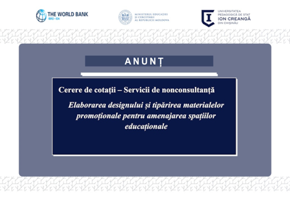 Anunț specific de achizițiiCerere de cotații – Servicii non-consultanțăȚara: Republica MoldovaInstituția: Instituția Publică Universitatea Pedagogică de Stat „Ion Creangă” din ChișinăuTitlul proiectului: Învățământul Superior din Moldova Titlul subproiectului: Asigurarea calității și relevanței formării profesionale a viitorilor pedagogi prin programe de studii inovative și conexe la piața muncii, (ACRVP) Obiectul achiziției: […]