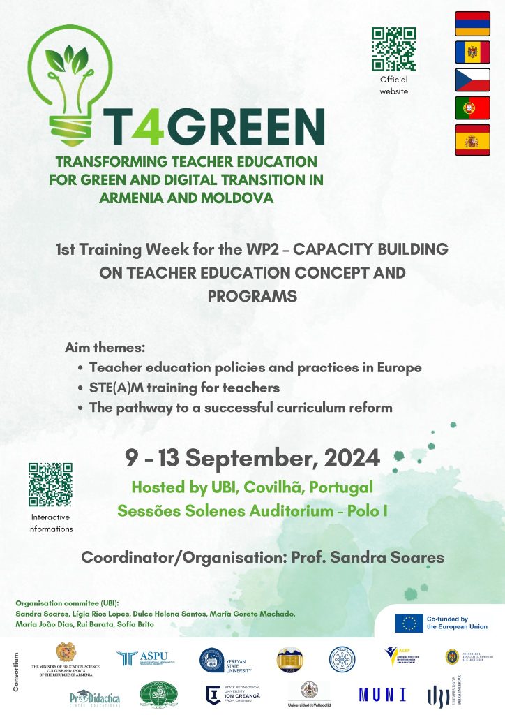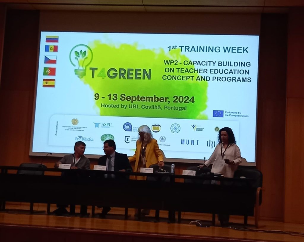 În perioada 09 – 13 septembrie 2024, cadrele didactice ale UPSC – dr. conf.univ. Lașcu Tatiana, dr. conf. univ. Chiriac Tatiana, dr. conf. univ. Gînju Stela, dr. conf. univ. Sochircă Elena și dr. conf. univ. Grigorcea Sofia au participat la un program de formare în cadrul Proiectului internațional T4 GREEN Erasmus Project – Transforming Teacher Education for Green and Digital Transition in Armenia and Moldova la Universitatea Beira Interior din localitatea Covilha, Portugalia. Evenimentul a reunit peste 40 de profesori și factori de decizie din Armenia, R. Moldova și alte țări ale Uniunii Europene (Portugalia, Spania, Cehia), oferind o platformă pentru schimb de idei, bune practici și strategii inovative în domeniul educației verzi și digitale.