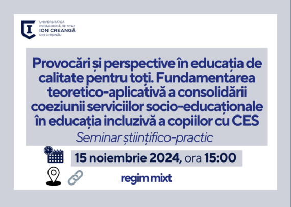 Catedra de asistență socială (subprogramul de cercetare și inovare 040114 Consolidarea serviciilor educaționale și sociale pentru asigurarea educației incluzive a copiilor cu CES) organizează seminarul științifico-practic Provocări și perspective în educația de calitate pentru toți. Fundamentarea teoretico-aplicativă a consolidării coeziunii serviciilor socio-educaționale în educația incluzivă a copiilor cu CES. Evenimentul […]