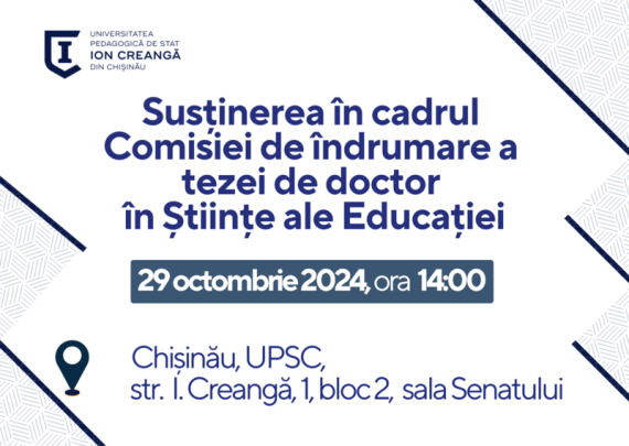 Candidat: CRIȘAN Elena Conducător științific: STRATAN Valentina, dr., conf. universitar Tema tezei: UTILITATEA SOFT-URILOR EDUCAȚIONALE ÎN REMEDIEREA TULBURĂRILOR DE LIMBAJ LA ELEVII CU DEFICIENȚĂ DE INTELECT Specialitatea științifică: 534.01 – Pedagogie specială Data: 29.10.2024 Ora: 14:00 Locul: Sala Senatului UPSC „ Ion Creangă” din Chișinău 1. Olărescu Valentina, dr., profesor […]