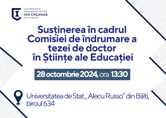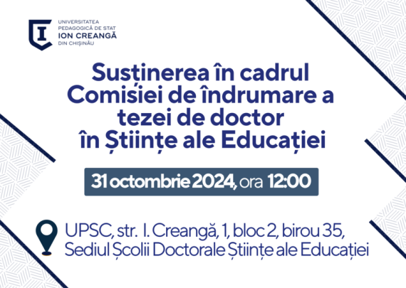 Candidat: OPREA Oana-Miruna Conducător științific: ȘOVA Tatiana, dr., conf. univ. Tema tezei: MANAGEMENTUL CONDIȚIILOR DE ÎNVĂȚARE PENTRU STIMULAREA SUCCESULUI ȘCOLAR Specialitatea științifică: 531.01 Teoria generală a educației Data: 31 octombrie 2024 Ora: 12:00 Locația: Biroul 35, blocul 2, Sediul Școlii Doctorale Științe ale Educației 1.Borozan Maia, dr. hab., prof. univ. […]