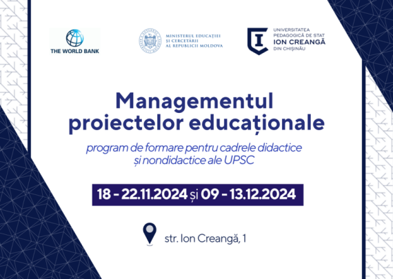 În contextul serviciilor planificate în cadrul subproiectului CONSOLIDAREA EDUCAȚIEI ÎN CARIERA DIDACTICĂ PENTRU PERFORMANȚA PROFESIONALĂ (EduPerformance), finanțat de Banca Mondială, Acord: MD-MOED-6542-ASF-U2-01 din 27 noiembrie 2023, Universitatea Pedagogică de Stat „Ion Creangă” vă invită la programul de formare „Managementul proiectelor educaționale”. Formator: dr., conferențiar universitar, Răduț-Taciu Ramona, Facultatea de Psihologie şi Ştiinţe ale Educaţiei, Universitatea „Babeş-Bolyai”, Cluj-Napoca. Sesiunile vor avea […]