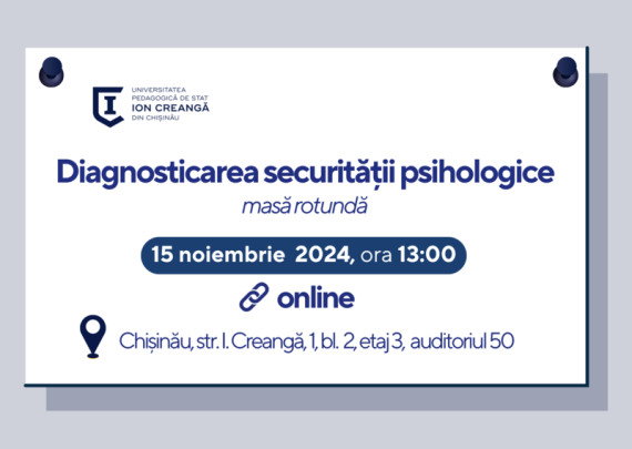 Laboratorul de Studii Strategice în Domeniul Securității Psihologice (SSPLab) din cadrul Universității Pedagogice de Stat „Ion Creangă” din Chișinău vă invită să participați la masa rotundă cu tema „Diagnosticarea securității psihologice”, eveniment înregistrat ANACEC, care va avea loc în format mixt, pe 15 noiembrie 2024, începând cu ora 13:00. Detalii […]
