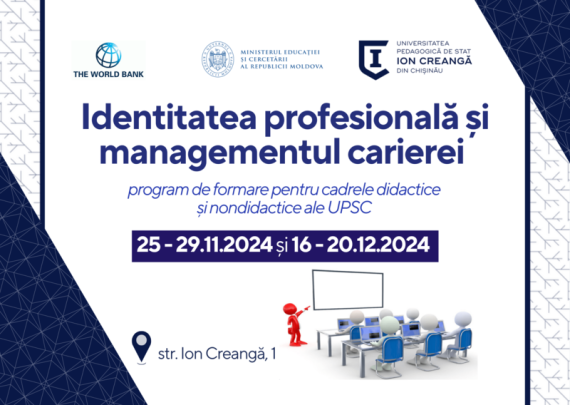 În contextul serviciilor planificate în cadrul subproiectului CONSOLIDAREA EDUCAȚIEI ÎN CARIERA DIDACTICĂ PENTRU PERFORMANȚA PROFESIONALĂ (EduPerformance) finanțat de Banca Mondială, acord: MD-MOED-6542-ASF-U2-01 din 27 noiembrie 2023, Universitatea Pedagogică de Stat „Ion Creangă” Vă invită la programul de formare „Identitatea profesională și managementul carierei”. Formator: dr., conferențiar universitar, Stan Cornelia, Facultatea de Psihologie şi Ştiinţe ale Educaţiei, Universitatea „Babeş-Bolyai”, Cluj-Napoca. Sesiunile […]