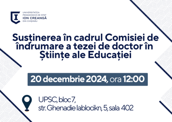 Candidat: MEIROȘU Ionela Conducător științific: OVCERENCO Nadejda, doctor, conferențiar universitar Tema tezei: „FUNDAMENTE PSIHOPEDAGOGICE ALE EDUCAȚIEI PARENTALE ÎN CONTEXTUL FORMĂRII ORIENTĂRILOR AXIOLOGICE LA PREȘCOLARI” Specialitatea științifică: 531.01 – Teoria generală a educației Data: 20 decembrie 2024 Ora: 12:00 Locul: Universitatea Pedagogică de Stat „Ion Creangă” […]