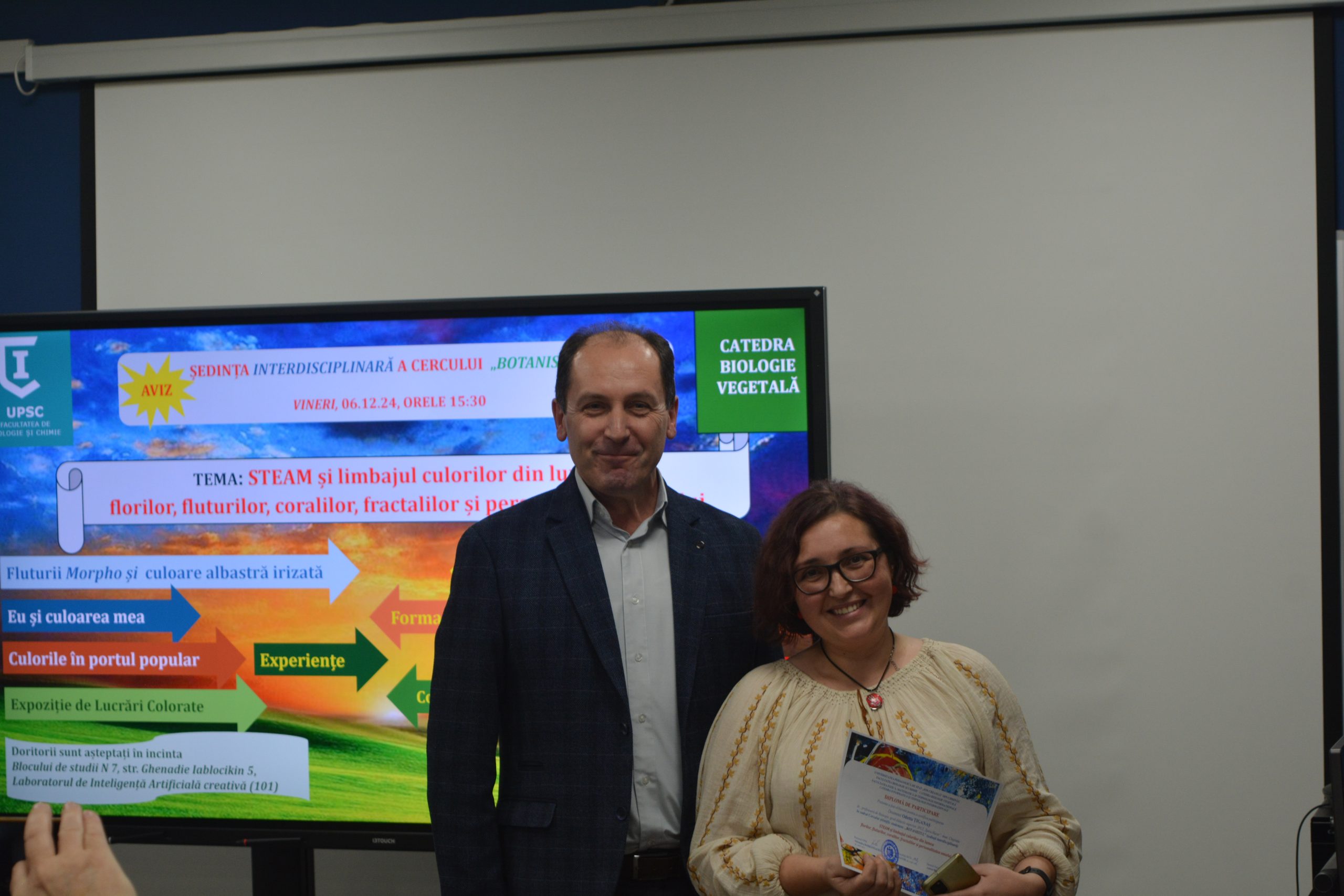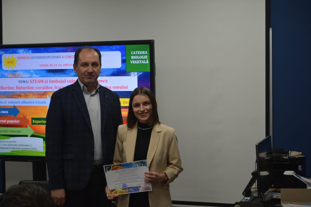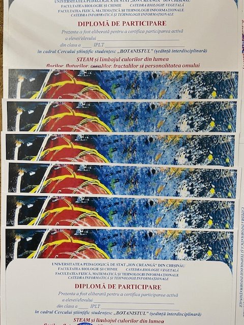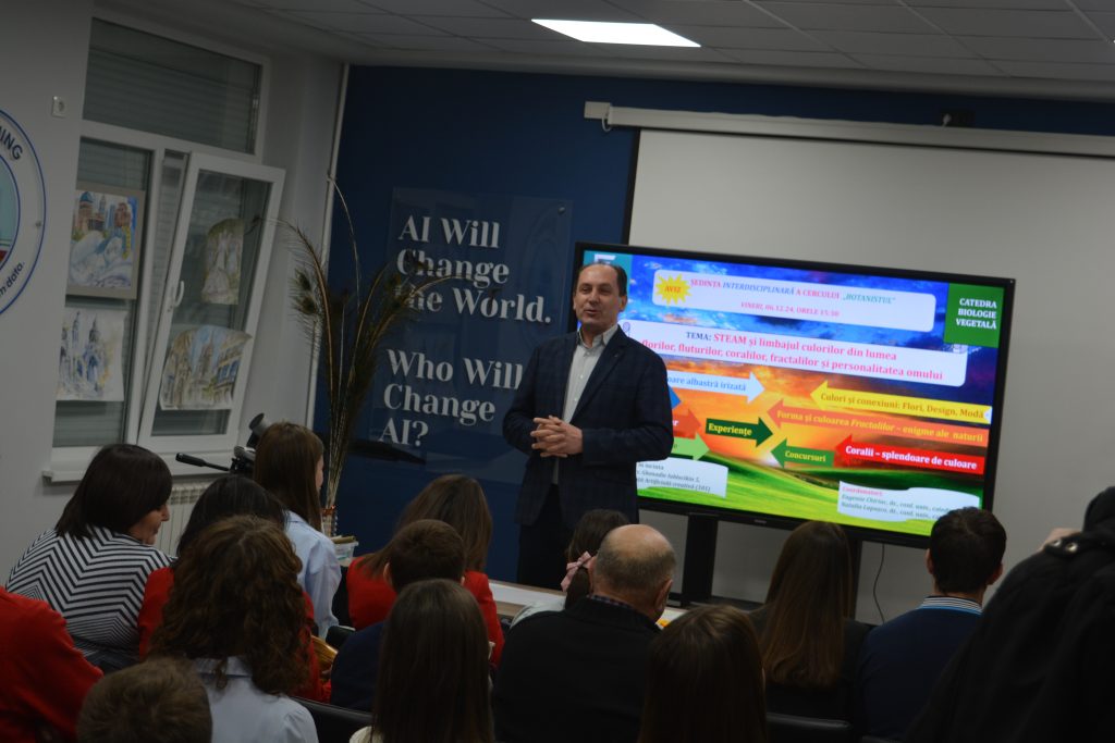La UPSC, în Laboratorul de Inteligență Artificială creativă, Facultatea FMTI, UPSC, în data de 6 decembrie 2024, s-a desfășurat ședința interdisciplinară a Cercului științific studențesc „BOTANISTUL” cu tema: STEAM și limbajul culorilor din lumea florilor, fluturilor, coralilor, fractalilor și personalitatea omului.